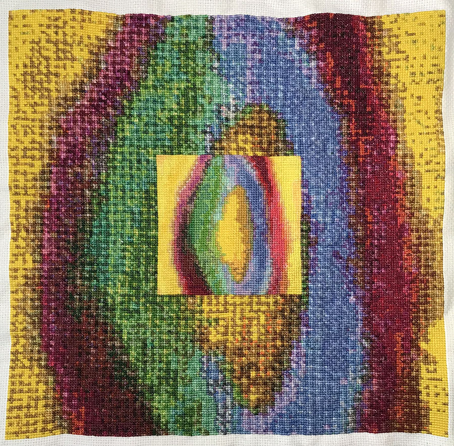This piece started life as a watercolor. I scanned a portion of the watercolor and turned that into a 60x60 cross stitch pattern that I worked in the center of the fabric. I then scanned the stitched 60x60 portion and created a 180x180 pattern that I worked on the same fabric.